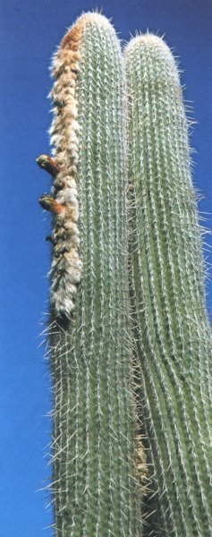 | This wonderful specimen of Espotoa lanianuligera was photographed near the Crisnejas river crossing ay Puente Crisnejas, Peru. It is an attractive form of the widely distributed Espostoa lanata. The cephalia are used by the local inhabitants who harverst the wool from them by cutting down the stems, as can be seen by the damage to this specimen. | ![]() |